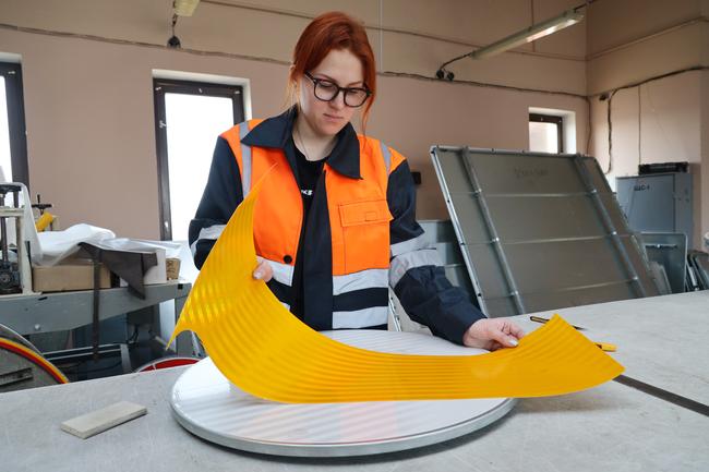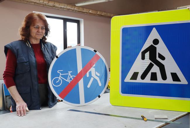 – Осенью нашему предприятию исполнится 30 лет, я работаю здесь 29. В девяностые был закуплен импортный комплекс: компьютер, сканер, плоттер, аппликатор, и мы стали делать знаки на постоянной основе, – рассказывает главный специалист по изготовлению технических средств организации дорожного движения СУ № 1 Татьяна Басаревская. – У меня есть надежная помощница Полина Зарянкина. В 2025 году мы с ней изготовили 4344 знака. Сначала я произвожу на компьютере расчеты необходимых металлических основ, которые затем заказываются вместе со световозвращающей пленкой – она дает гарантию на знак от 7 до 10 лет. Дальше, как говорится, дело техники и рук. Из новых знаков – «Автозаправочная станция» и «Видеоконтроль БПЛА».